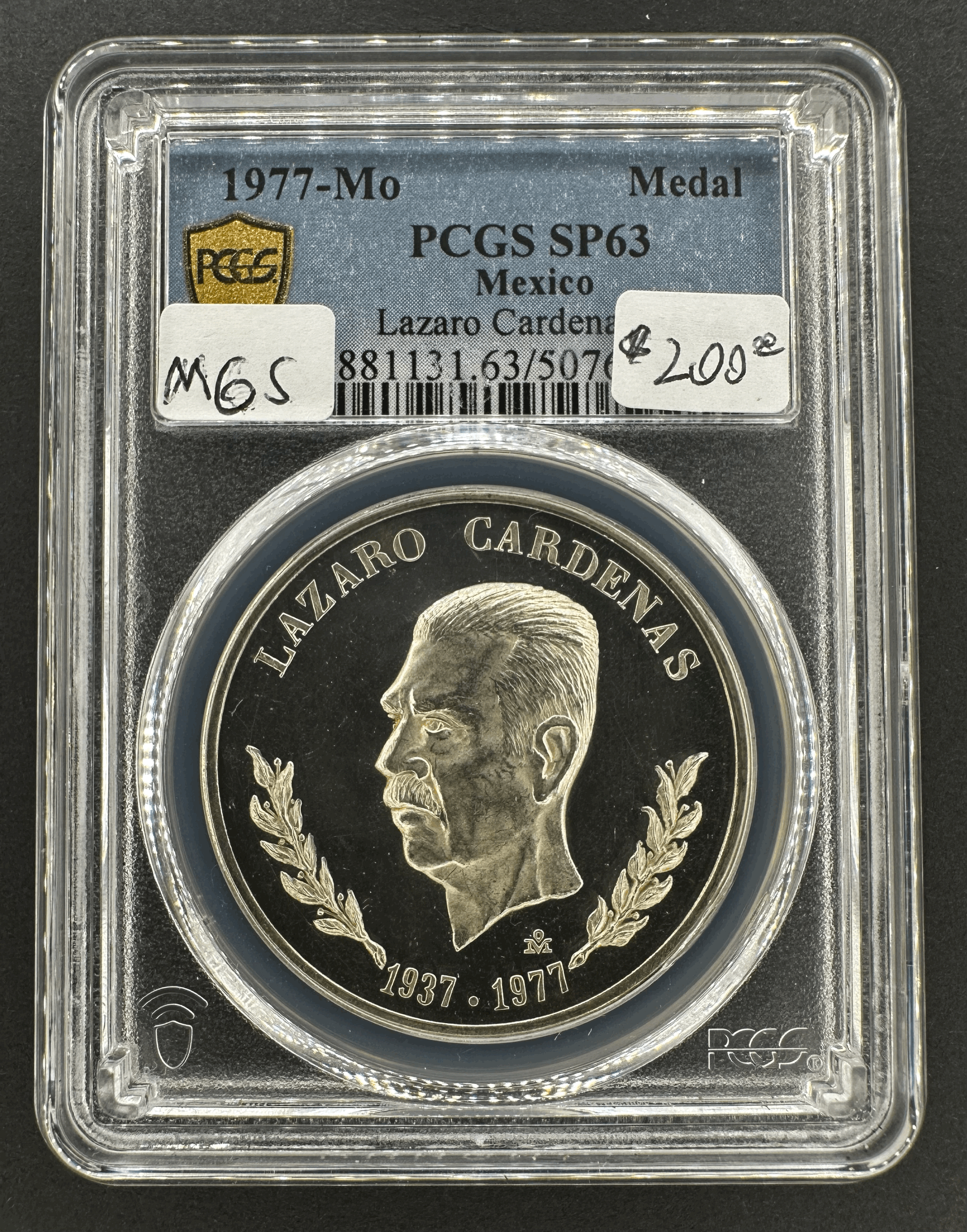 Sold out 2023 200th Ann. Fundacion de Jalisco $280.00 Sold out Medal 50 Pesos 100th Ann Ag 2 Oz Silver Satin $800.00 Sold out Israel-Mexico Silver Israel Medal 33.6g Mexico City Spanish PCGS SP64 $200.00 Sold out 1977 Medalla Lazaro Cardenas $200.00 Sold out 2024 Medalla Andres Manuel Lopez Obrador AMLO $180.00