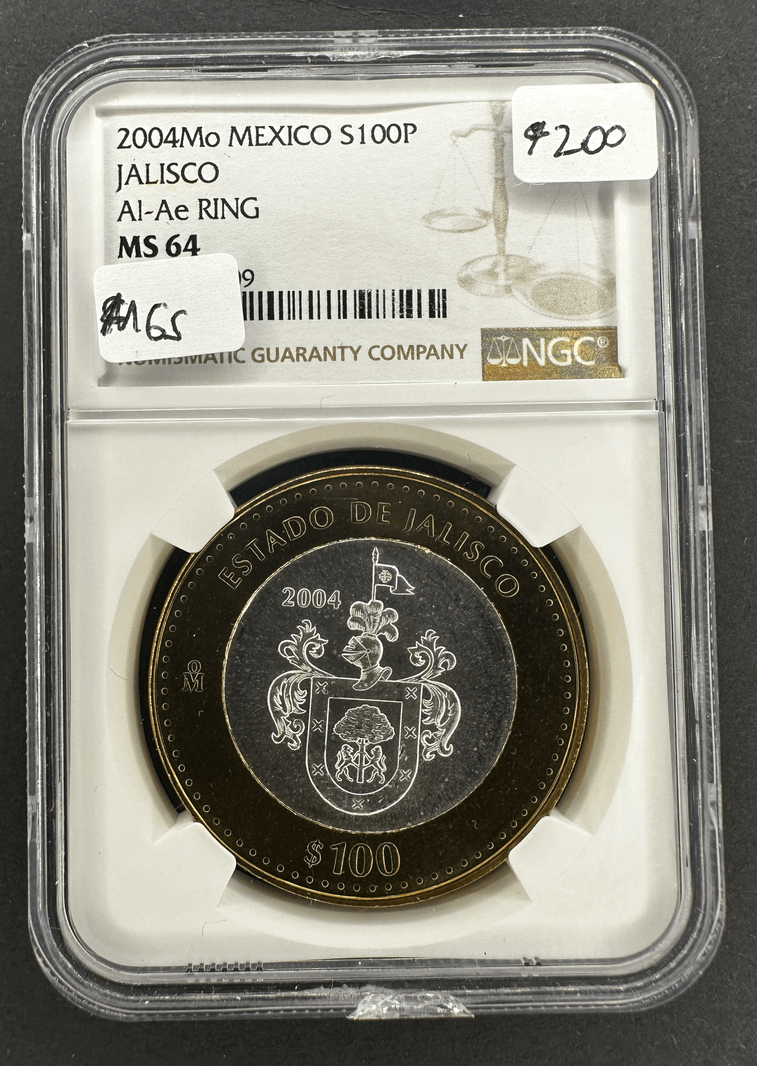 Store › 2004 Jalisco 100 Pesos Image 1 of 2 Image 2 of 2 2004 Jalisco 100 Pesos $200.00 sold out 2004 MEXICO 100 PESOS SILVER BIMETALLIC COIN ESTADO DE JALISCO 1st PHASE. NGC MS64 Sold Out Added! 2004 MEXICO 100 PESOS SILVER BIMETALLIC COIN ESTADO DE JALISCO 1st PHASE. NGC MS64